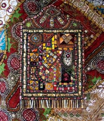 So, what is Rajasthani Tapestry Mosaics anyway? A brief description is as follows: For years I have been collecting gorgeous wall hangings that are assembled in Gujarat, Rajasthan and Jaipur, India. These hangings are richly embroidered and embellished with silks, jewels, sequins, seeds, beads, pearls, rhinestones, shells, etc. Each piece of fabric is overlaid onto another piece of fabric, and woven together like a crazy quilt.