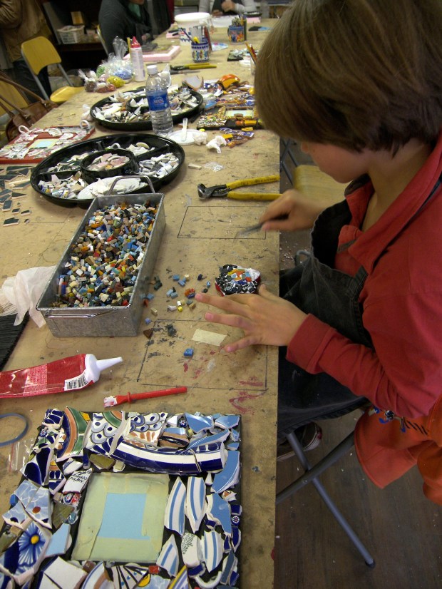 Atelier d’un jour consacré à la coupe des smalti en petits morceaux – ‘micro’ et installation de l’œuvre sans coulis.