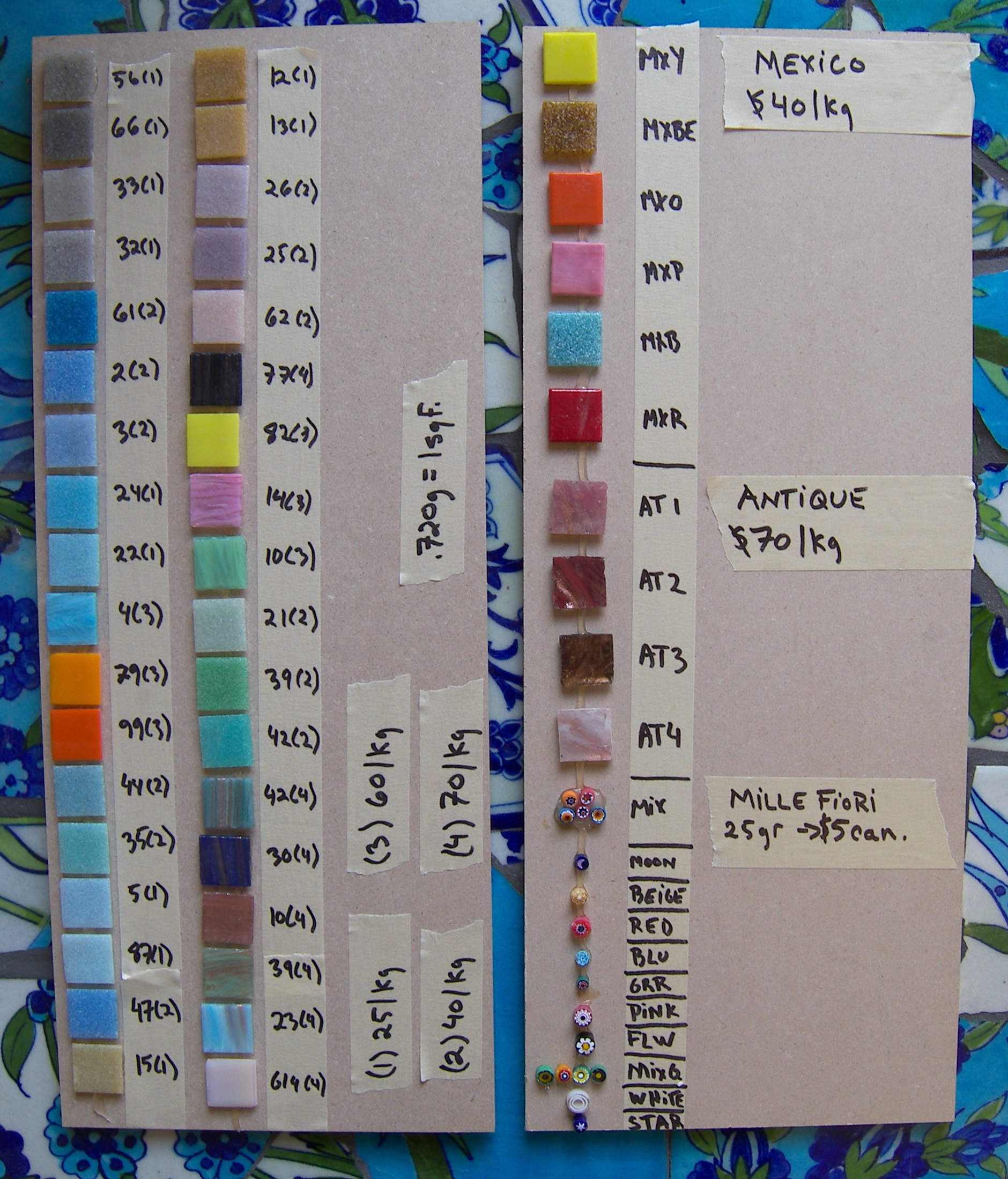 Bisazza coulours. Prices: group (1)- $25/kg; gr(2)-$40/kg; gr(3) $60/kg; gr(4) $70/kg. Millefiori 100gr is 20$, purchase the quatities you want.