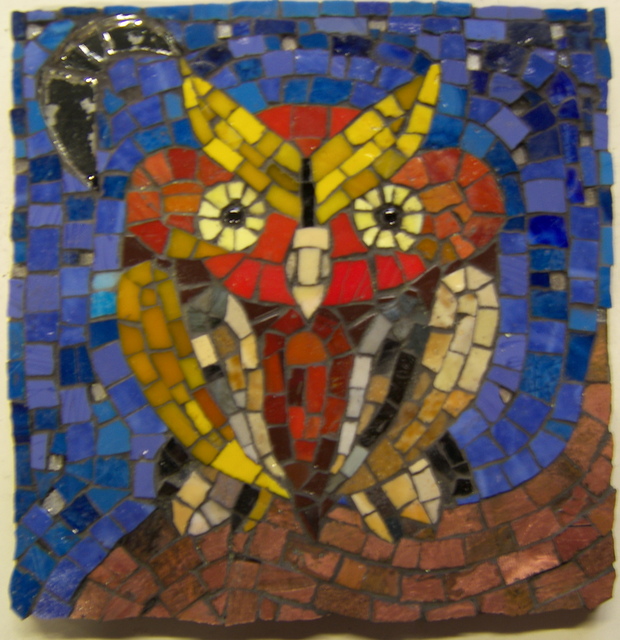 Suzanne S (non, ce n’est pas moi) a fait comme deuxième projet ce hibou. Une autre qui profite de mes lots de matériel unique…Les smalti cuivrés sont des antiquités de chez Orsoni. Mosaikashop est maintenant en rupture de stock de ces trésors….