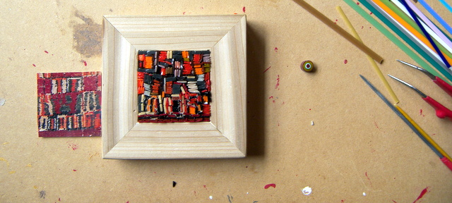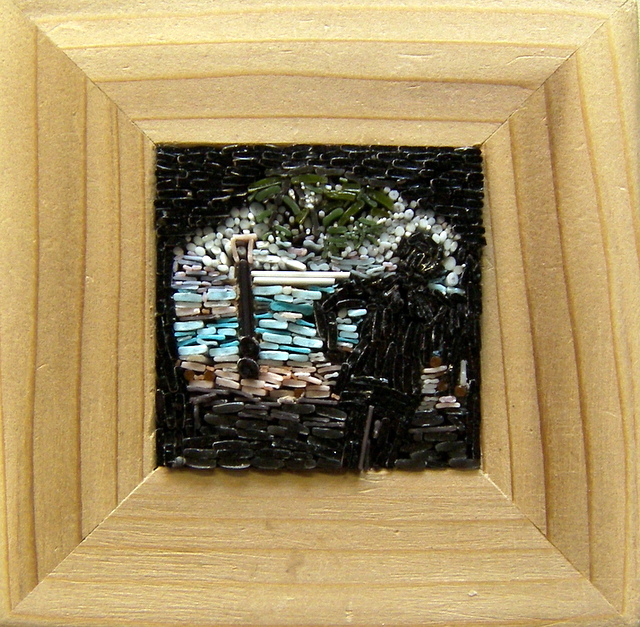 The next 2 day micro mosaic class will take place Saturday April 20 and the 27th. This mosaic class turned out to be a great success and very appealing. Here is an other example of a student micro mosaic. Nathalie Lavoie did her husband looking into the sea in Greece. Me too I had taken the class, here is what I did, nothing other than a detail of a rug. Click here for the information about the class.