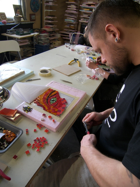 At Mosaikashop it’s all about the students and their mosaics! I love to exhibit my mosaics amongst thiers pretending to be incognito, haha. Student production is slow but fast at the same time as I find myself having a hard time exhibiting many that so deserve to appear in the blog. My files of photos are impressive and I am grateful to also like to take photos and show them off.