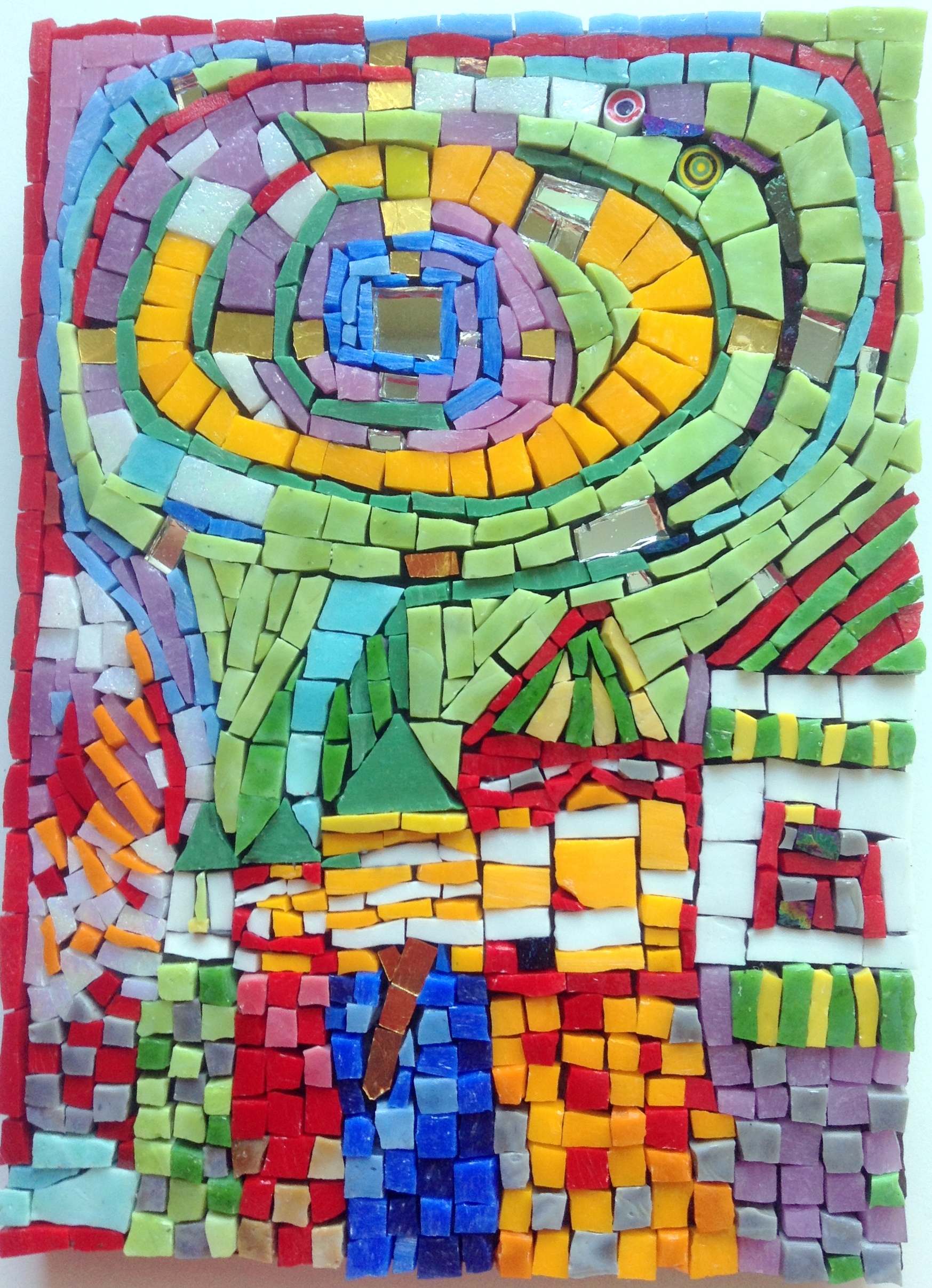 Jeannine was so delighted to finish her glorious mirror. It is made of very small pieces of millefiori made of fimo doe which she did herself, also of original millefiori, mirror, smalti, stained glass and other goodies.