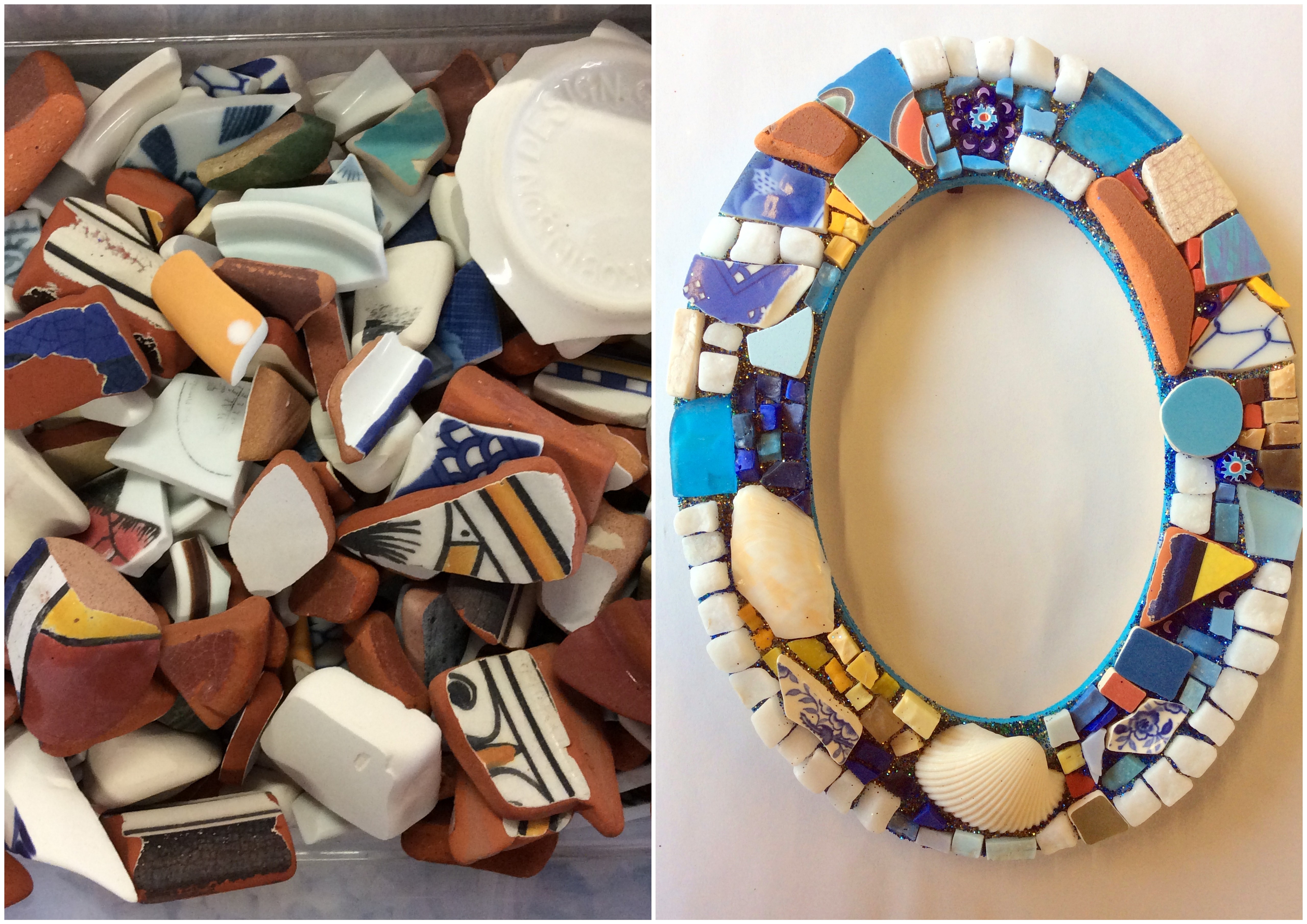 De la mosaïque facile et rapide sans coulis? Cela vous dit? Des smalti, céramique, marbre et vaisselles baratées ‘tumbled’ disponibles à vendre ou on peut les barattées pour vous! Info : suzanne@mosaikashop.com