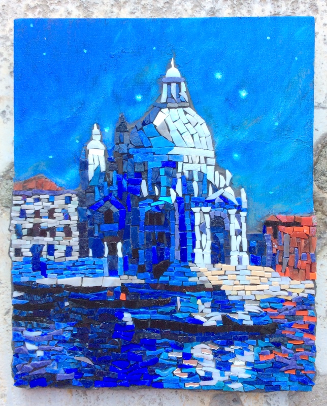 This is my mosaic Venice tribute I made before my trip to bring me luck. It is made according to a painting by Ferdinand du Puigaudeau (1864-1930) Veduta di Venezia, Santa Maria della Salute. The mosaic measures 22cmx28cm, it is made of smalti, marble, gold and my friend Alexandra Pennycook painted the sky for me!  I traveled with it and I am proud to say that it now lives in Italy, I am very jelous of my works but it is like a part of me living there!