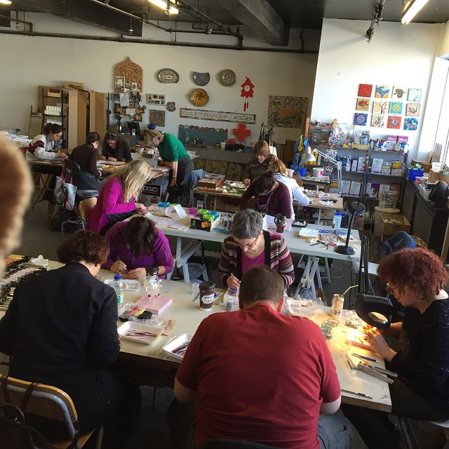 Cette semaine j’ai attrappé la “fièvre du printemps”! Alors attention! J’ai commencé à déposer des trucs dans 2 grosses boîtes: “À donner” et “À vendre pour pas cher”! Elles sont très populaires! Toute mosaïque abandonée ou dont je ne peux me rappeler le nom de l’étudiant ira dans une de ces 2 boîtes. Il faut comprendre qu’il y a une limite au temps de remisage des mosaïques incomplètes. Je me suis joué un tour en permettant les ateliers libres illimités pour terminer une pièce, dommage, maintenant je devrai imposer des limites. L’espace est restreint et le sera encore plus dans un proche avenir.