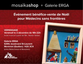 Mosaikashop @ La Galerie ERGA organise son événement bénéfice-vente de Noël pour Médecins Sans Frontières. Vernissage : le vendredi 2 décembre 2016, 18h – 22h.